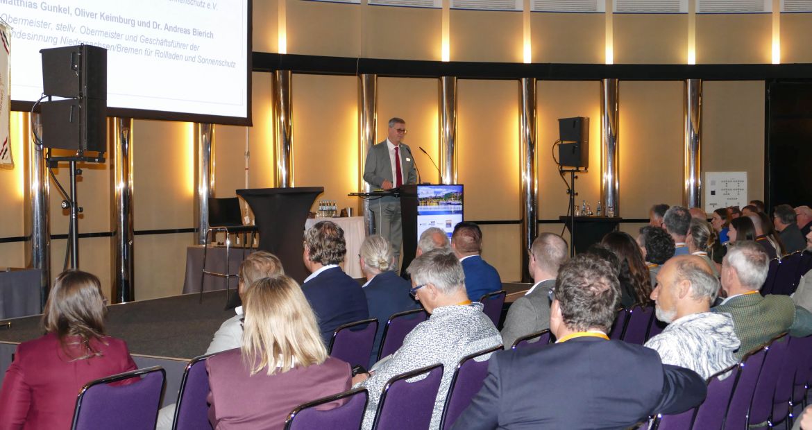 Matthias Klenner, neuer Präsident des BVRS, begrüßt die Teilnehmenden der 63. Haupttagung des Verbandes in Bremen. Foto: bauelemente bau