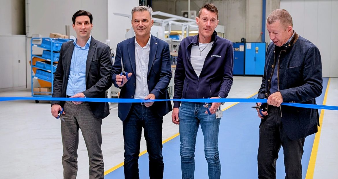 Beim feierlichen Durchschneiden des Bandes (v.l.): Florian Eisermann, Uwe Ziewers, Joachim Geibel und Wieland Frank. Foto: Siegenia