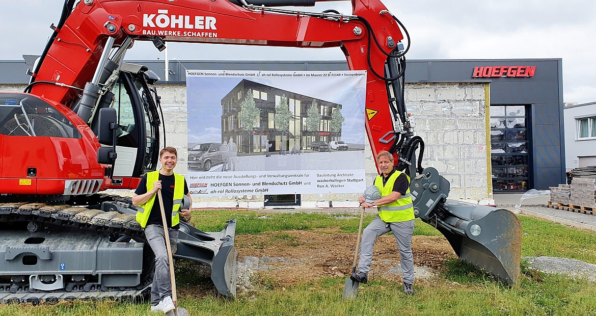 Rund 35 Jahre nach der Gründung der Firma Hoefgen Sonnen- und Blendschutz realisiert sich nun der Traum vom eigenen Firmengebäude für das Unternehmen aus Steinenbronn bei Stuttgart. Am 8. Juni 2020 fiel der Startschuss für den zweiten Bauabschnitt. Das bereits bestehende Werkstatt- und Produktionsgebäude wird durch einen repräsentativen Ausstellungs- und Bürokomplex ergänzt, der Anfang des nächsten Jahres in Betrieb genommen werden soll.